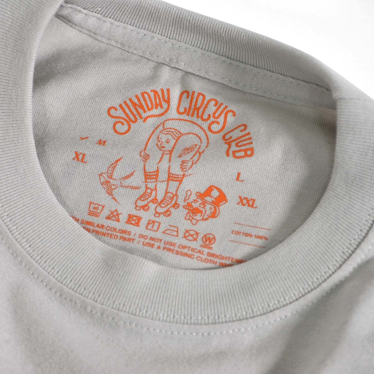 ブラックなタイガーに咥えられながらも笑顔のサーカスガールが、SUNDAY CIRCUS CLUB らしいユーモアがポップに表現されたデザイン。