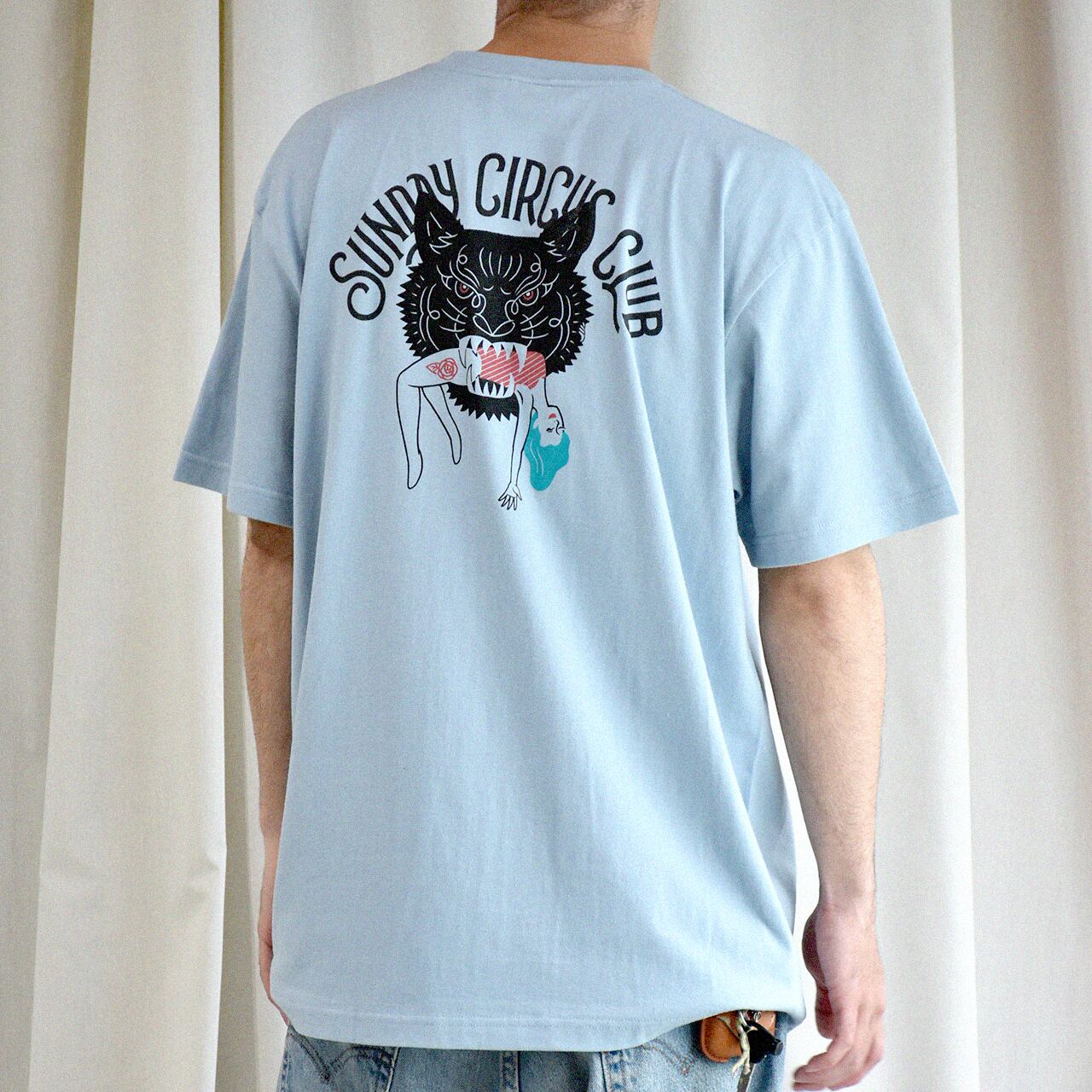 ブラックなタイガーに咥えられながらも笑顔のサーカスガールが、SUNDAY CIRCUS CLUB らしいユーモアがポップに表現されたデザイン。